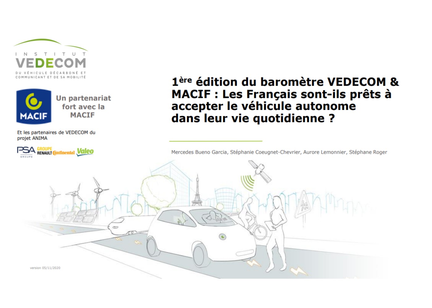 Pour favoriser la mobilité inclusive et durable notamment dans les territoires ruraux et périurbains, la Macif a créé une communauté d’intérêt, le laboratoire d’innovation Movin’Lab, composée de 11 entreprises qui a pour objectif de déployer des solutions de véhicule autonome. Pour éclairer les travaux de Movin’Lab, la Macif a souhaité réaliser le 1er baromètre d’acceptation du véhicule autonome avec Vedecom pour savoir comment les Français envisagent le véhicule autonome (VA) dans leur quotidien à l’avenir, pour quels usages et avec quel degré de confiance. Les questions posées ont permis de récolter des données sur leur perception spontanée du VA en termes de sécurité, confiance, protection des données personnelles et attitudes, et l’évaluation de leur acceptabilité.