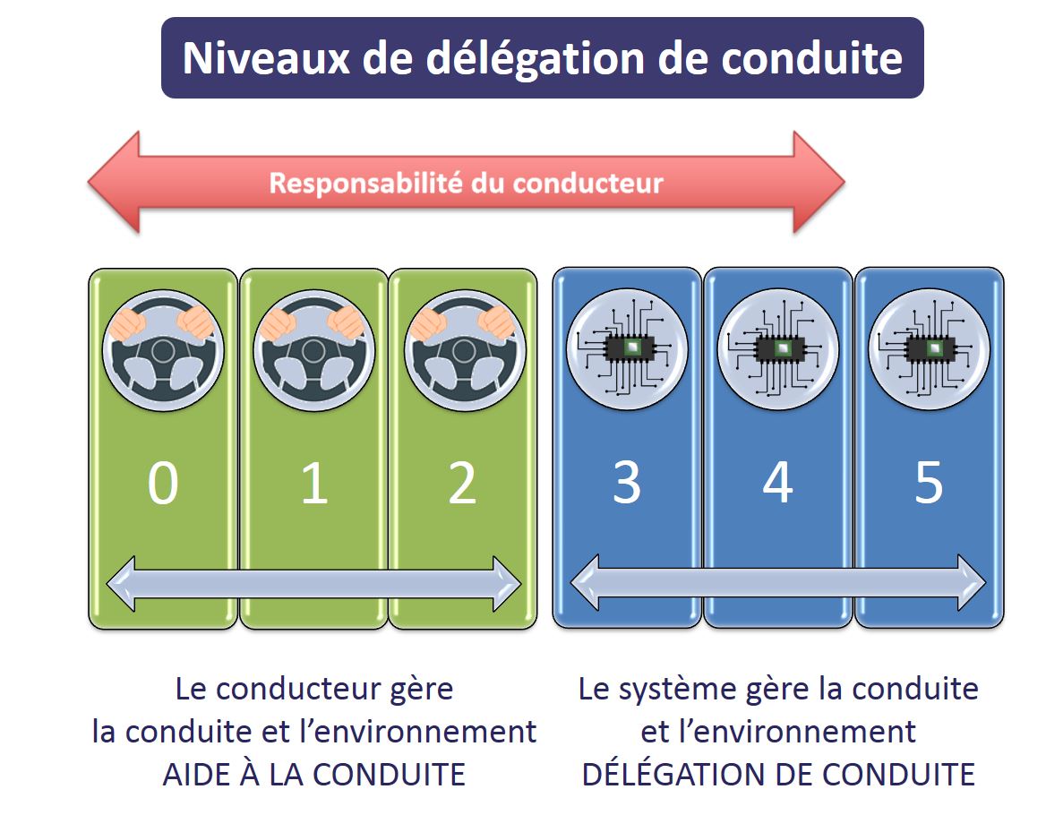 Ce référentiel détaille les différentes étapes et les conséquences induites sur la conduite : "les mains sur le volant", "sans les mains", "en aveugle", "sans attention" et "sans conducteur". Les niveaux 1 et 2 (assistance à la conduite, véhicule semi-autonome) équipent déjà les véhicules en circulation ; les niveaux 3 et 4 (conduite avec une personne à bord et conduite sans conducteur en circuit fermé) commencent à se développer. Le niveau 5 (automatisation complète, véhicule autonome sans conducteur) reste pour l’instant embryonnaire au stade de la recherche et des essais.