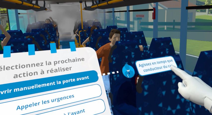 - 2 scénarios composés d’une expérience virtuelle de départ de feu après un accrochage avec un véhicule léger puis d’une seconde expérience de renversement du car avec évacuation des passagers par les issues de secours et les vitres du véhicule lourd.