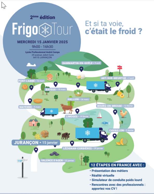 Le mercredi 15 janvier prochain, le Lycée André CAMPA situé à JURANCON ouvre ses portes au Frigo Tour et accueillera les scolaires de 09h00 à 12h30 et les adultes en démarche d'orientation ou en recherche d'emploi de 14h00 à 16h30 afin de les sensibiliser aux métiers frigoriques du transport et de la logistique.