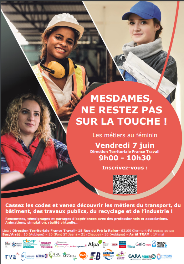 L'AFT sera présente le vendredi 7 Juin à Clermont-Ferrand de 09h à 12h30 pour une matinale destinée spécifiquement au public féminin afin de casser les codes et de découvrir les métiers du transport, du bâtiment, des travaux publics, du recyclage et de l'industrie.