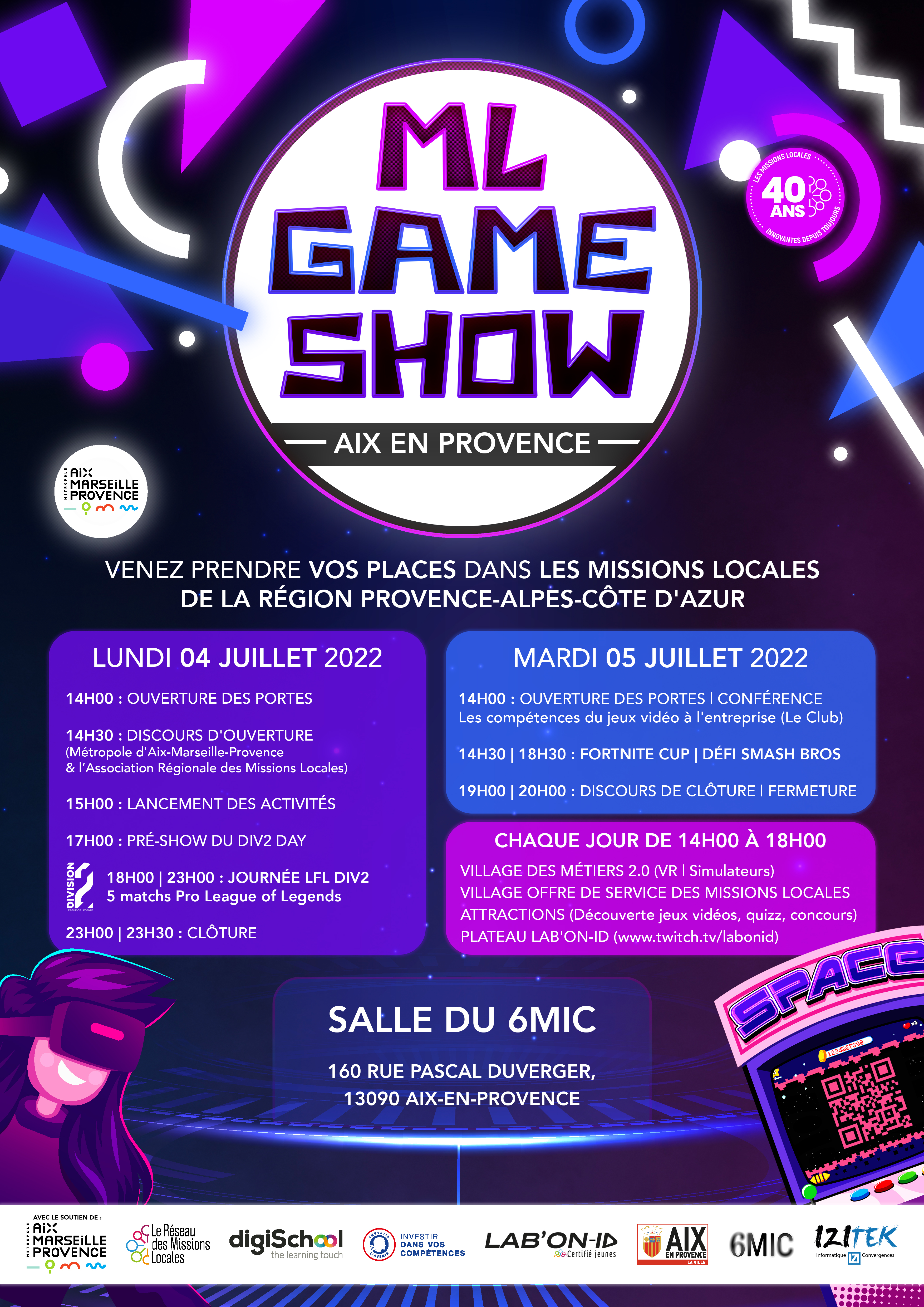 A l’occasion du lancement des festivités des 40 ans des Missions Locales, le Réseau des Missions Locales de la Région Sud Provence Alpes Côte d’Azur organise avec le soutien de la Métropole d’Aix Marseille-Provence, en partenariat avec digiSchool & Webedia la première édition du ML Game Show les 4 et 5 juillet au 6 MIC à Aix en Provence.