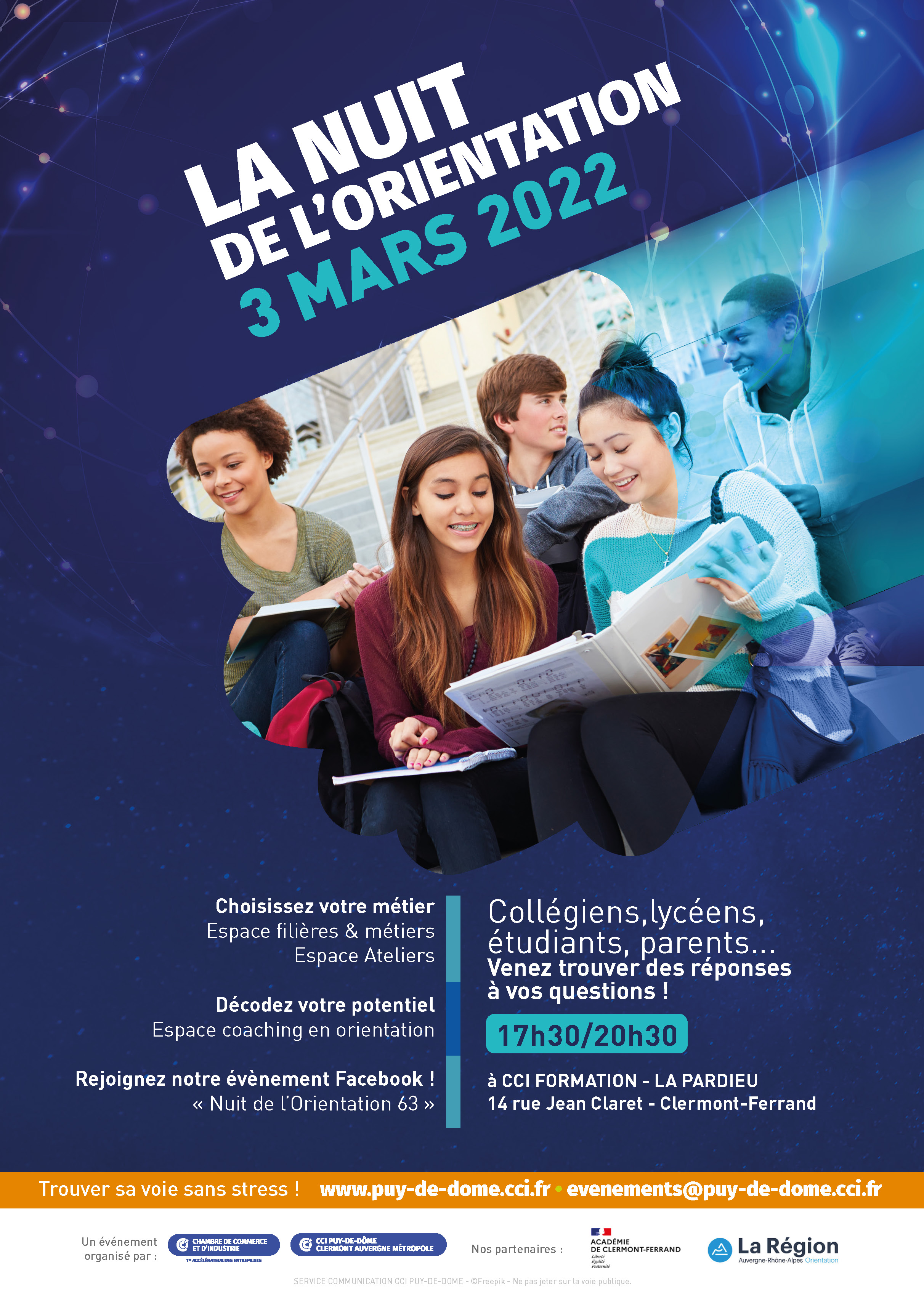 La CCI Puy-de-Dôme Clermont Auvergne Métropole accueillera cette année, pour sa 15ème édition, la Nuit de l’Orientation. L’édition 2022 se déroulera jeudi 3 mars de 17h30 à 20h30 à Clermont-Ferrand dans les locaux de CCI Formation.