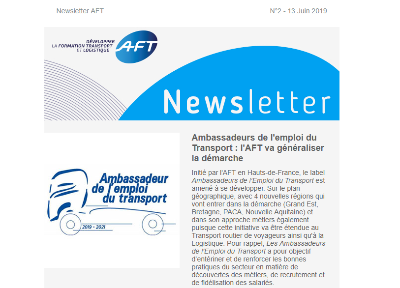 Ambassadeurs de l'emploi du Transport : l'AFT va généraliser la démarche, Salon Jeunes d’avenirs de Marseille : des entreprises du secteur ont rencontré des candidats, Le Championnat de France des élèves conducteurs routiers 2019 a rendu son verdict, Un nouveau véhicule-école pour le lycée Joseph Cugnot à Chinon, Parrainage/Marrainage : une belle aventure à renouveler, Signature d'une charte de partenariat entre l'AFT et SNCF Réseau sur la sécurité aux passages à niveau ...