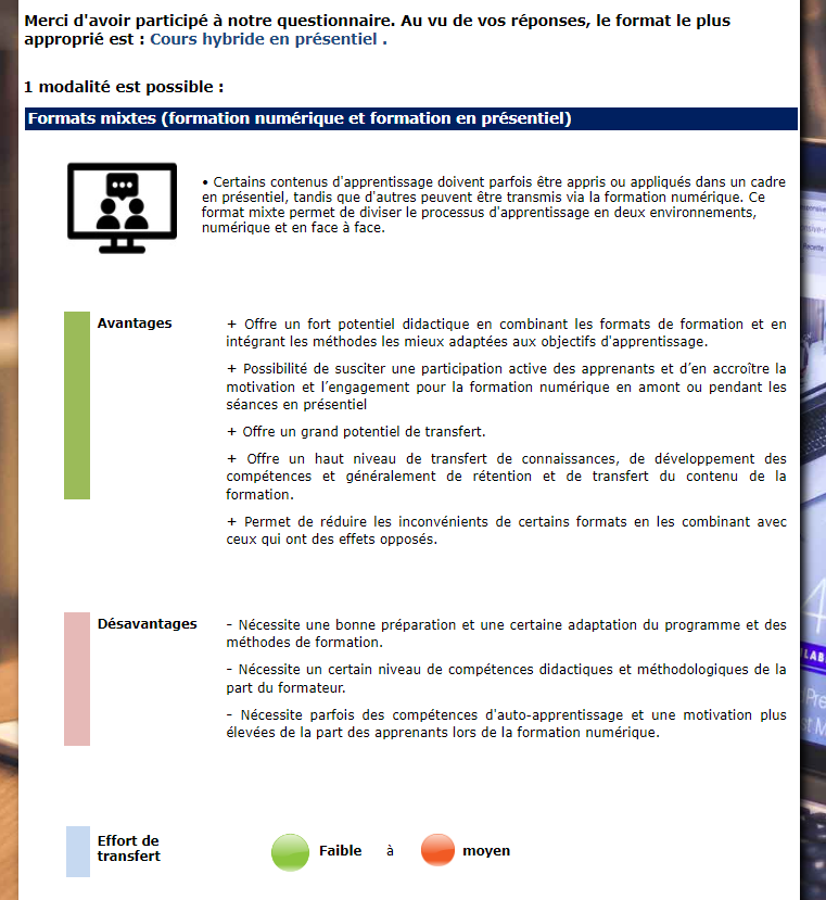 - For each pedagogical proposal, the advantages and disadvantages are explained (e.g. a solution may be interactive and dynamic, but have the disadvantage of requiring a lot of time for correction or for restitution, etc.)